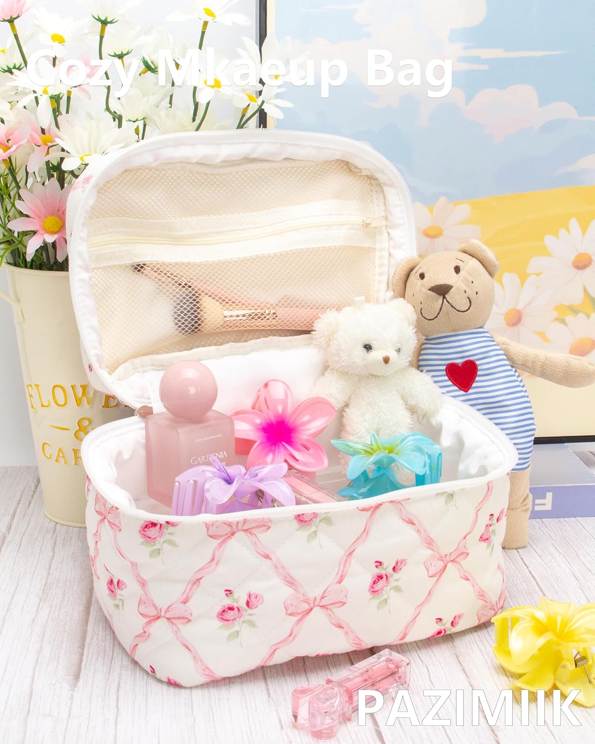 PAZIMIIK 3PCS Makeup Bag SET Large Travel Quilted Zipper Soft Cosmetic Case Pouch for Women Girls Make Up,Bow Rose
