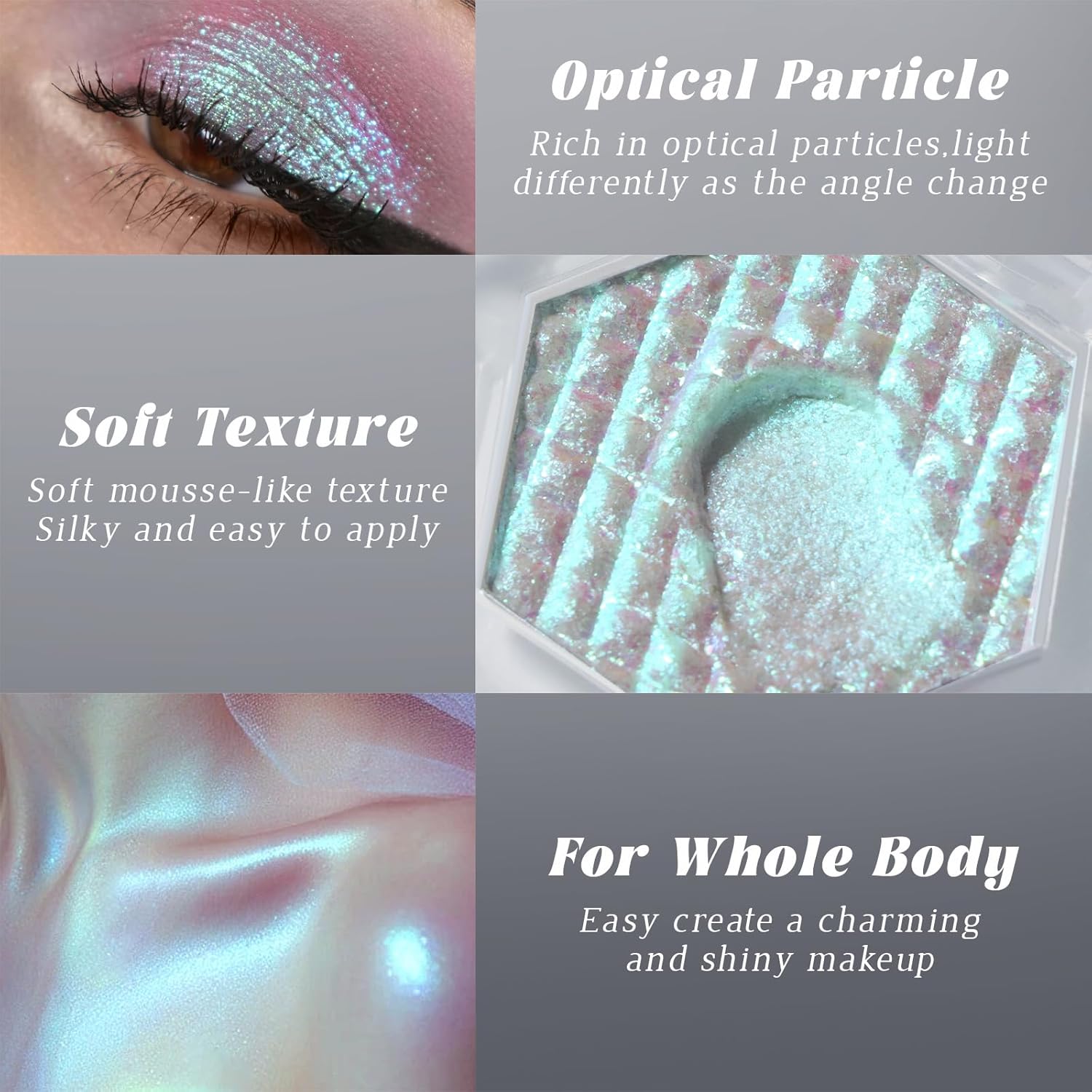 - Chameleon Mermaid Eyeshadow: Intense Color Shifting, Different light and angle will present different colors, holographic glitter eyeshadow will bring you special eye makeup