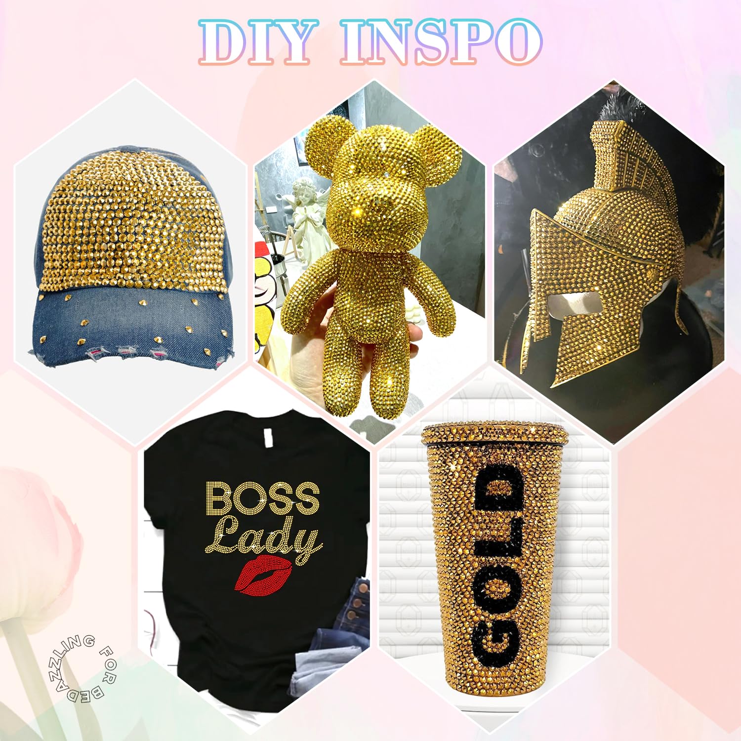 - PACKAGE CONTENT – This all-in-one bedazzler kit includes everything you need to start creating dazzling designs: 1 box of Gold rhinestones with 24 grids (approx. 30,000 pcs of bedazzling rhinestones assorted size SS6/10/16/20/30 ), 1 precision tweezers, 1 pickup pen for handling small gems, and 3 tubes of B7000 jewelry glue for secure application.