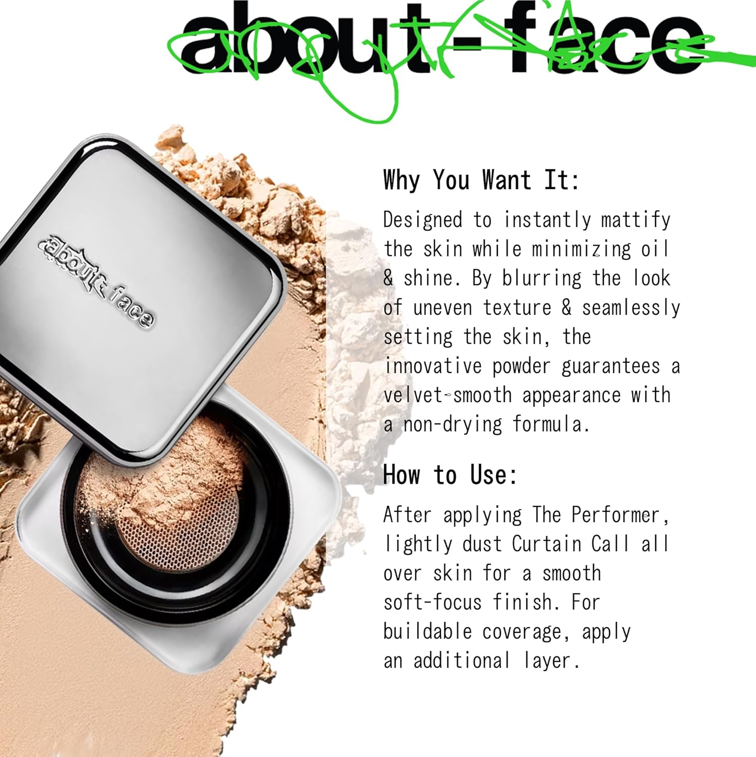 about-face Curtain Call Set & Smooth Loose Powder Veil – Lightweight, Oil-Absorbing Setting Powder with Rice Starch & Corn-Based Talc Alternative – Vegan, Cruelty-Free, Clean Beauty – 0.35oz (Light)