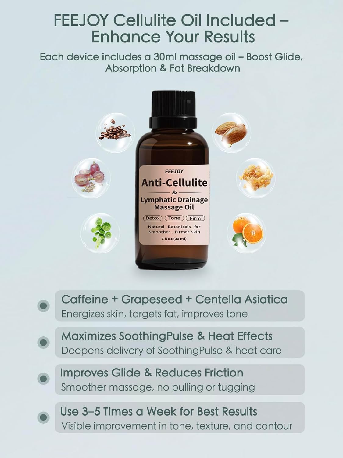 - Boost Results with FEEJOY Cellulite Oil โ Recommended Pairing: Includes FEEJOY Anti-Cellulite & Lymphatic Drainage Massage Oil infused with caffeine, grape seed, and centella. Pairing with the oil enhances glide, absorption, and fat-targeting results. Use 3โ5 times a week for visible improvement in tone, texture, and body shape.