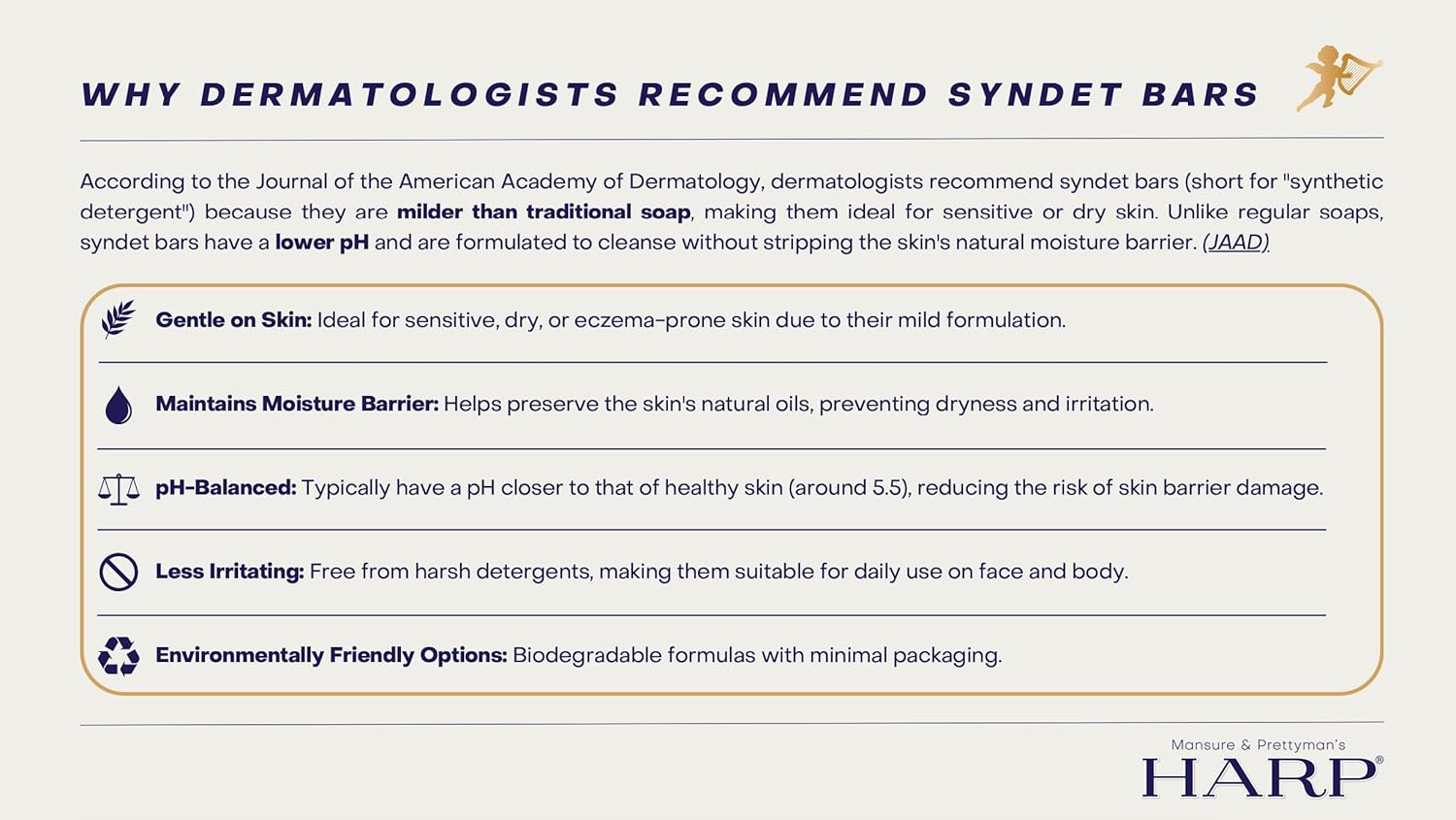 - pH-Balanced 5.0-6.0 to match and retain the skin's natural moisture barrier. Completely saponified vegetable oil free so it wont dry your skin. HARP products are not blends either, we do 100% syndet bars. Theres nothing better or more gentle on the market.