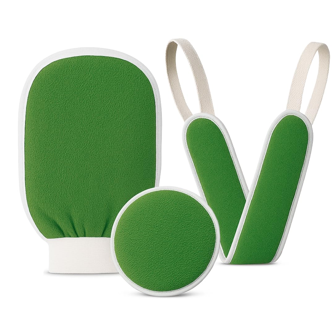 Exfoliating Glove Set (Original) β 3 Pieces Moroccan Hammam Scrub Mitts for Face, Body & Back β Deep Skin Cleansing & Dead Skin Removal β Reusable Spa Exfoliator β Assorted Colors (GREEN)