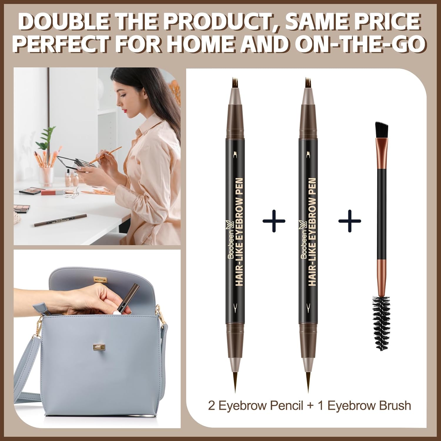 - 【2-in-1 Eyebrow Pen and Eyeliner】:Boobeen double-ended eyebrow pencil:One end features a precise square angled brush tip that effortlessly creates defined,3D eyebrows, while the other end is an eyeliner that perfectly contours the eye shape to draw smooth, flawless lines.