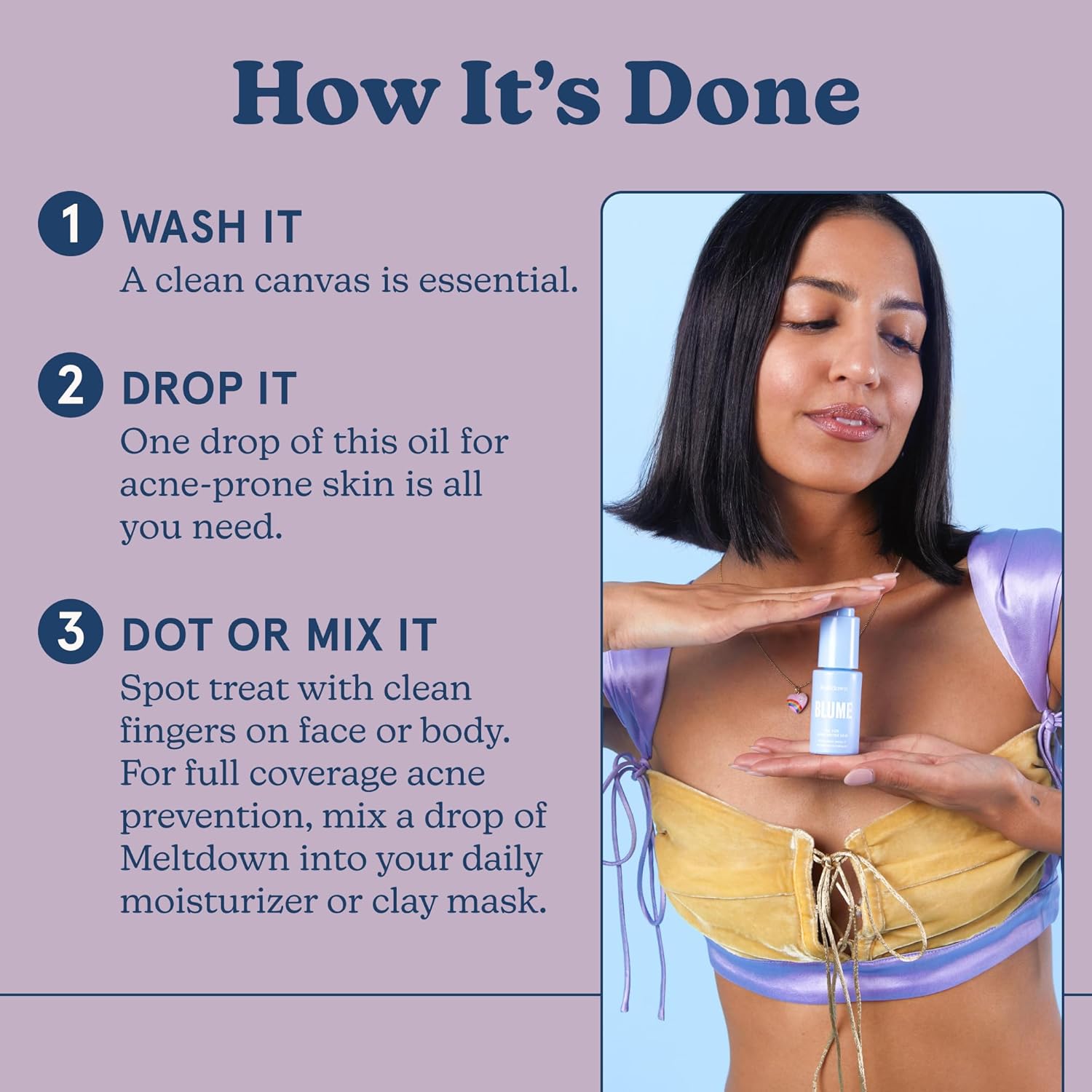 - How to Use - One pump is all you need. Spot treat with clean fingers on face or body. For full coverage blemish prevention, mix a drop of Meltdown into your daily moisturizer or clay mask.