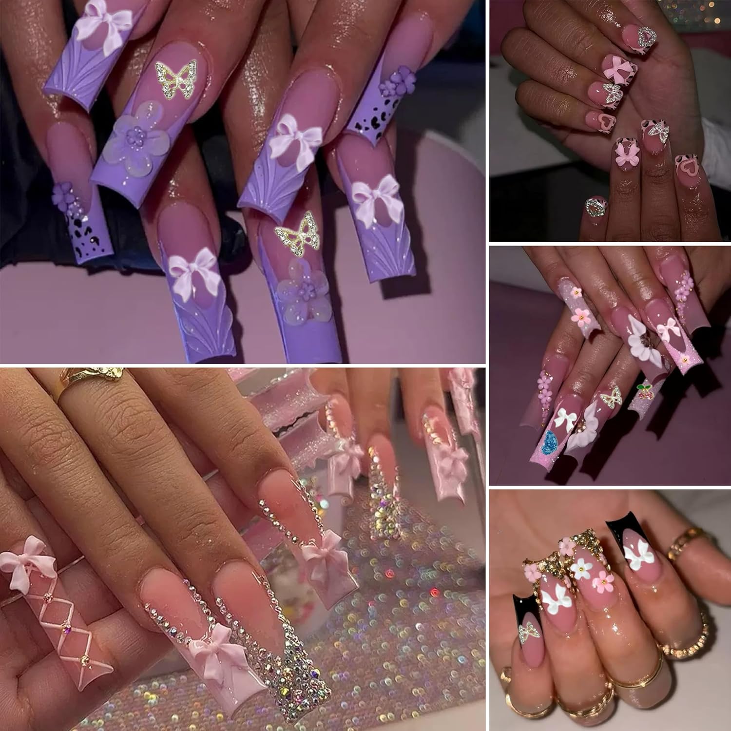 - Package Include: You will get 1 box nail charms of 3D butterflies, cherries, bows and flowers with golden silver caviar beads, as well as rhinestones and flatback pearls. Enough number of mixed styles of flowers charms to suit your needs