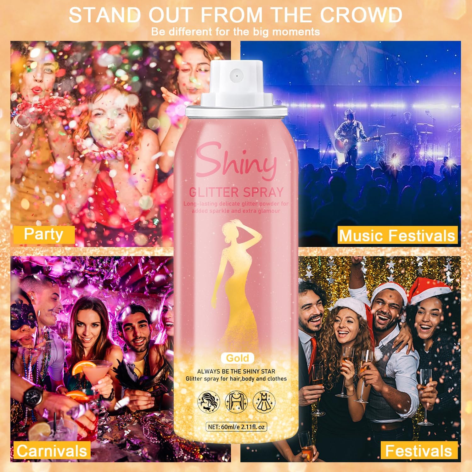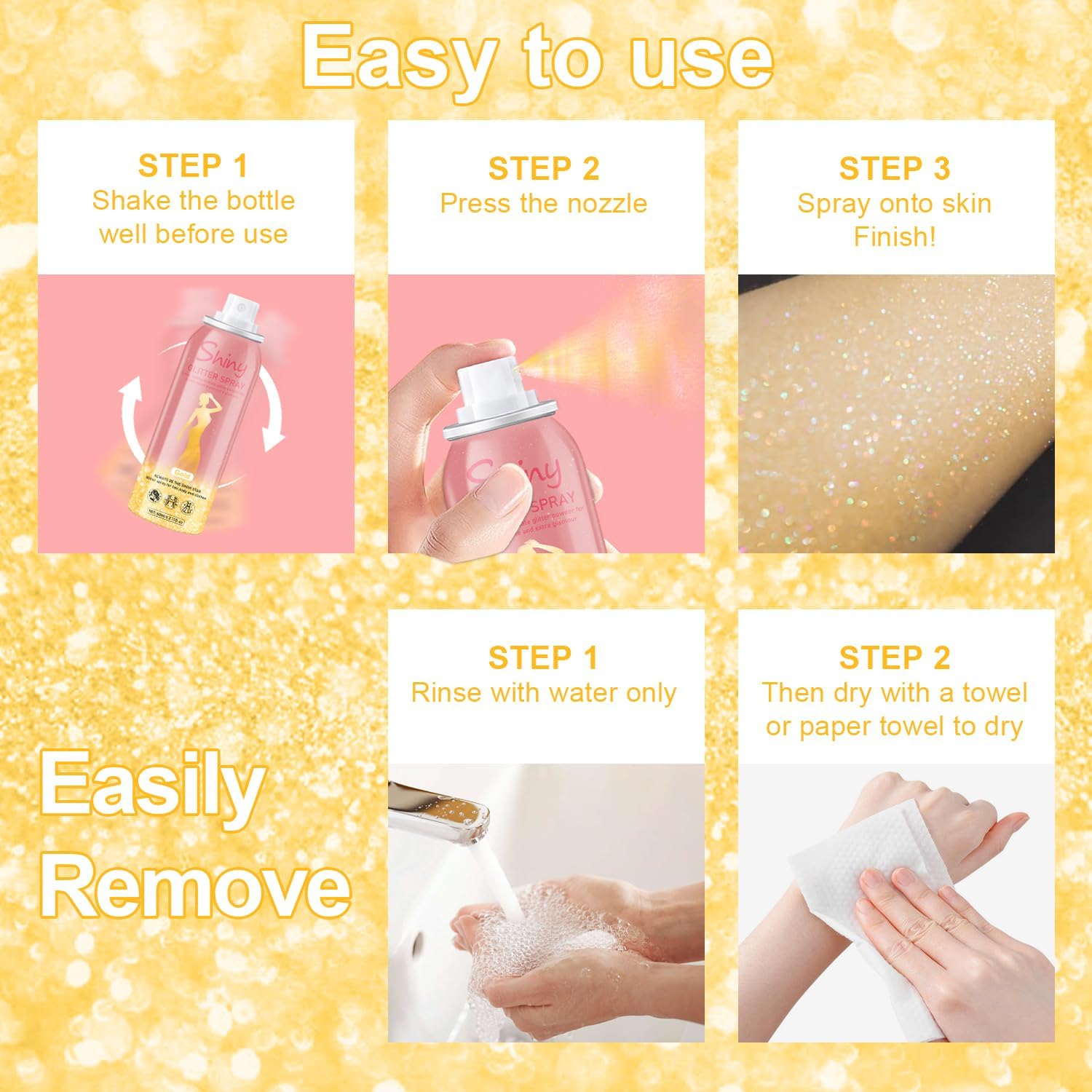 - Glitter Body Spray - The delicate and light glitter shimmer Powder easily to spray on hair, eyes, face, body, leg and clothing with shimmer makeup effect. Perfect to enhance skin gloss, unlock and set your shimmer makeup.