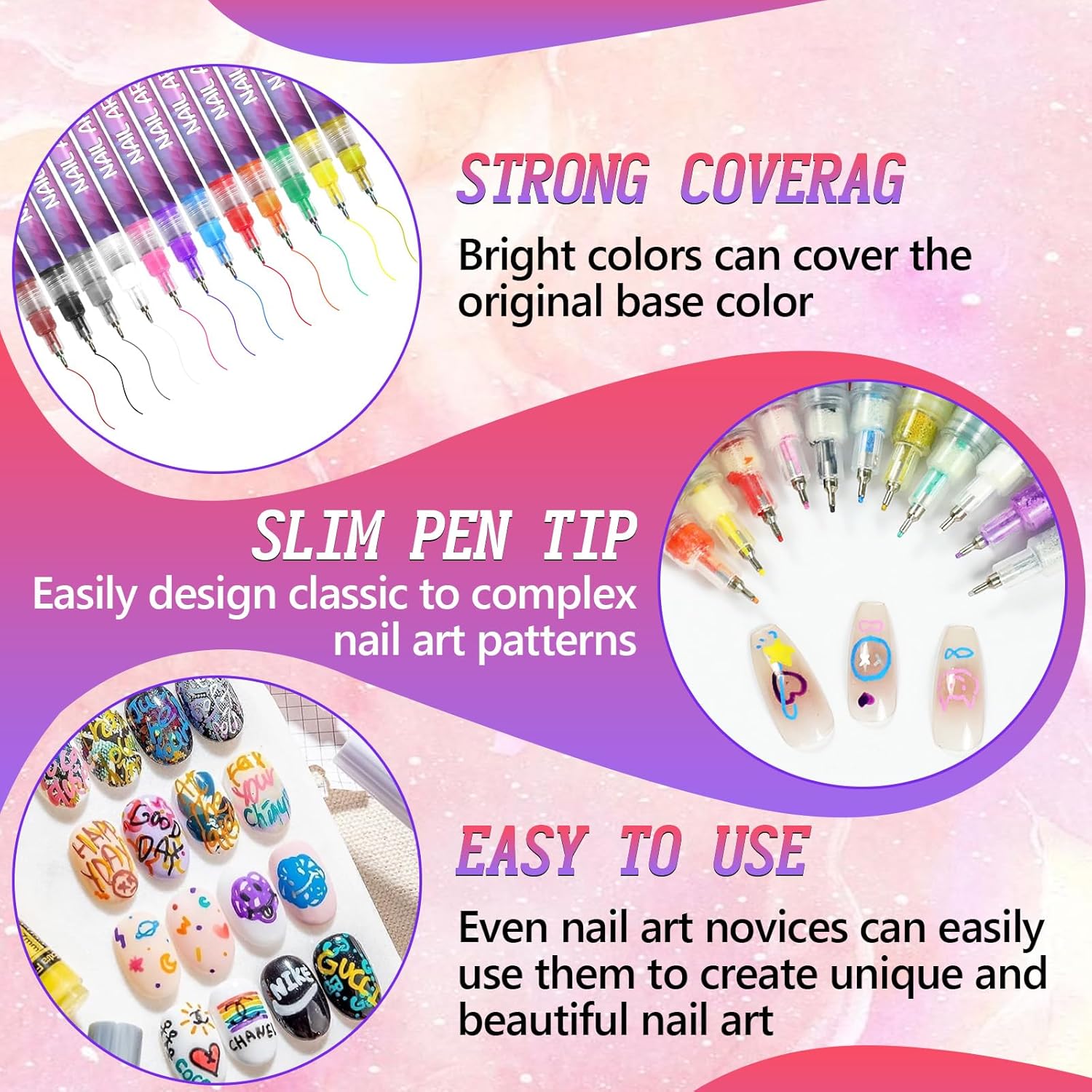 - 12 Bold and Vibrant Colors: Offers a range of rich, vibrant colors to make your nail art stand out. The opaque formula provides coverage in one stroke, making it perfect for layering designs on natural nails, gel nails, or press-on nails.